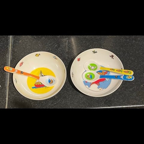 Bamse barntextilier set med mönster föreställande Bamse-figurer på ljus bakgrund. Setet innehåller flera delar i tyg som kan användas som skydd eller dekoration i barnrum.
