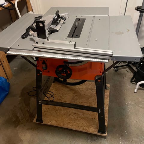 Bosch PTS 10 bordssåg med bordsfunktion. Utrustad med hjul och ställning för enkel förflyttning och stabilitet vid användning. Passar för kapning och sågning av trä och andra material i mindre verkstads- eller hobbyprojekt.