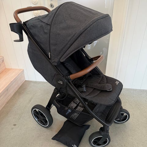 Britax barnvagn i beige och svart färg. Barnvagnen har en liggdel och sittdel, justerbart handtag samt hjul anpassade för olika underlag. Passar för barn och är designad med säkerhetsfunktioner.