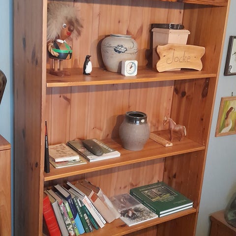 En bokhylla i bra skick. Finns ett extra hyllplan att få till men har tyvärr tappat bort fästena till den.