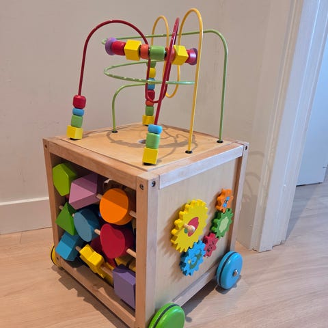 Baby Born aktivitetskub i trä med flera sidor som innehåller olika aktiviteter, inklusive kugghjul, klossar, pärlor på trådar och en räknare. Produkten är utformad för att stimulera barns motorik och problemlösningsförmåga.