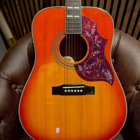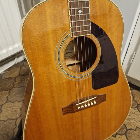 Epiphone halvakustisk gitarr i röd färg med två humbucker-pickuper och justerbara vred för volym och ton. Gitarren har en klassisk design med f-hål och är utrustad med stämskruvar av metall. Passar för olika musikstilar och speltekniker.