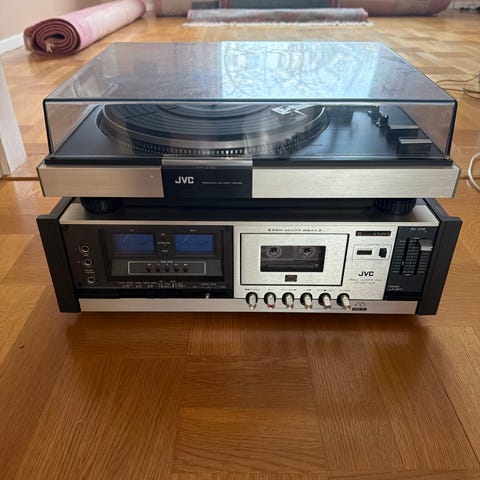 JVC JL-A1 skivspelare remdriven japansk, manuell skivspelare med fjädrande metallchassi och helt rätt träplint. S-formad tonarm utan PU med standard SME fäste. Samtliga funktioner är utan anmärkning och långtidstestad. Locket är i väldigt gott skick utan sprickor. 45 varvs adapter medföljer. Observera att det inte ingår nål men jag skickar med ett PU skal.