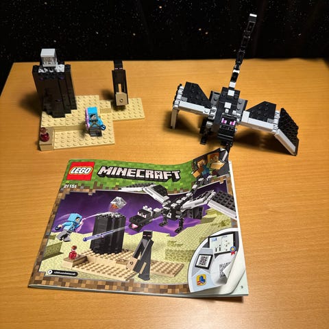 LEGO Minecraft byggsats som inkluderar figurer och bygginstruktioner. Passar för kreativ lek och konstruktion inom Minecraft-temat.