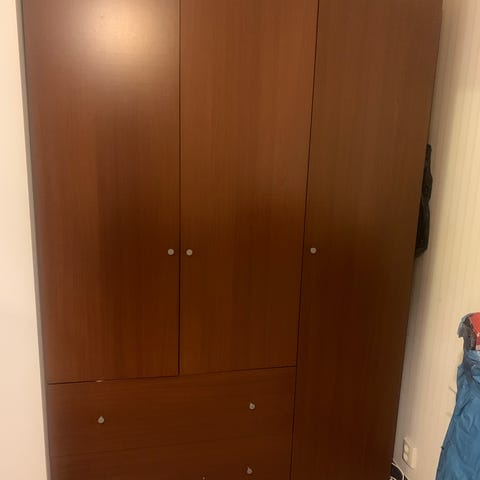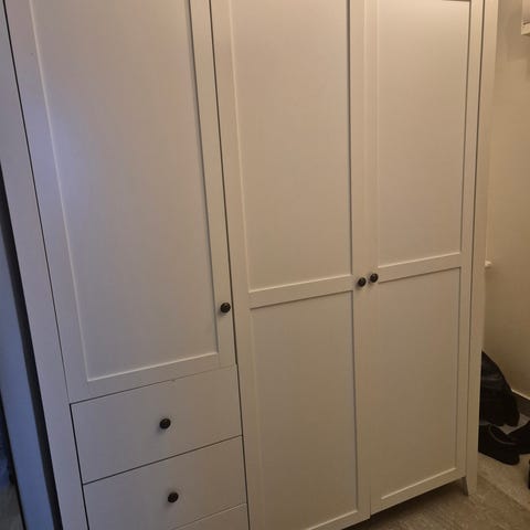 Speglade, fyra separata garderober som rymmer många saker. Garderoben med tre dörrar har sammanhängande galgar på två dörrar och hyllor på den tredje. Jag har inte öppnat den eftersom den har tillhörigheter inuti, men den är fläckfri, inte en enda repa. Den har använts varsamt och är praktiskt taget helt ny.