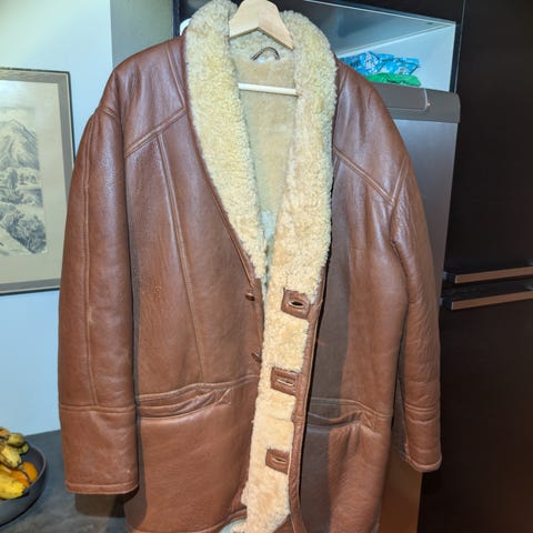 Klassisk vintage shearling-jacka från Hollies (Leaders in Leather) i mörkbrun läder med tjockt, äkta fårskinnsfoder (genuine lambswool fur) i krage och inuti – perfekt aviator/rancher-stil från 90/00-talet! Stor, varm och vindskyddande med den där råa, premiumkänsla som bara äkta shearling ger.