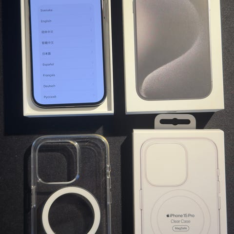 iPhone 15 Pro 128 GB Natural Titanium color. Phone is in absolutely perfect condition, not a single scratch or mark, like new. Everything works. Always had a case and a screen protector. Original box and original cable included. Have a receipt. Was purchased in Sweden for 14 990 kr. Phone still has screen protector applied + a few cases. Battery health is 85%.