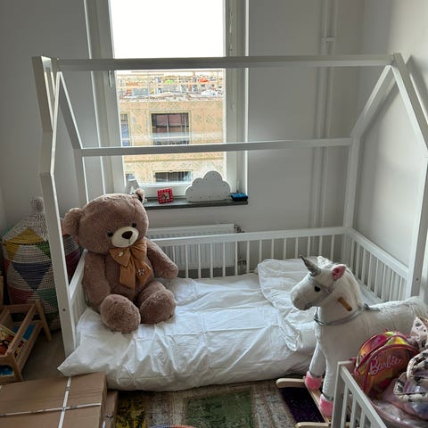 Jollyroom Juniorsäng i trä, märket Minitude Nordic JAX. Sängen är utformad för barn och har en ram som liknar ett hus, vilket kan bidra till en lekfull sovmiljö. Materialet är trä och sängen är anpassad för juniorstorlek, 70x140cm.