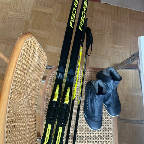 Skidpaket säljes. Vallningsfria längdskidor 160 cm, pjäxor storlek 37.