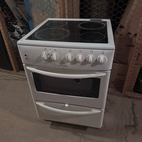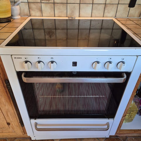Siemens glaskeramikspis med fyra kokzoner och inbyggd ugn. Spisen är vit och har traditionella vred för inställning av värme och ugnsfunktioner. Ugnen har innerbelysning och flera hyllpositioner för flexibel användning.