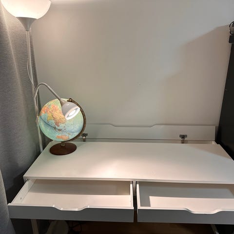 Säljer min ikea skrivbord som är synligt använt. Alla skåp o så funkar som vanligt. Borde i sig har några repor osv. Går att måla över så blir den som ny igen.