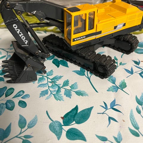 Volvo L180 hjullastare i gul färg. Modell av en hjullastare med detaljerad design som visar maskinens funktioner och struktur.