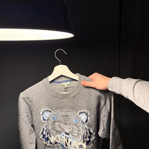 Kenzo Tröja för herr i storlek M, färg grå och tillverkad i bomull. Tröjan har lång ärm och ett tryck med Kenzo-logotypen fram.