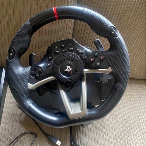 Playstation ratt och pedaler spelkontroll för bilspel. Inkluderar ratt och pedaler med anslutningskablar. Används med Playstation-konsoler och PC. Säljer för att jag köpte en bil. Ratten har används sparsamt bara lite dammigt
