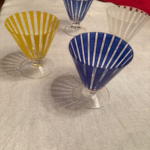 ”Clown”, fyra snapsglas design Anne Nilsson för Orrefors, handmålade, höjd 19,5 cm.
