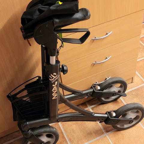 Vinröd rollator med stora hjul, stabil i terräng och vinterunderlag, sittplatta, plats för varukorg.