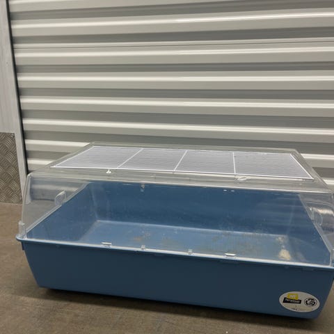 Stor bur, lxbxh 78x56x43 samt lock med galler. Buren har hjul och är lätt att flytta och rengöra.