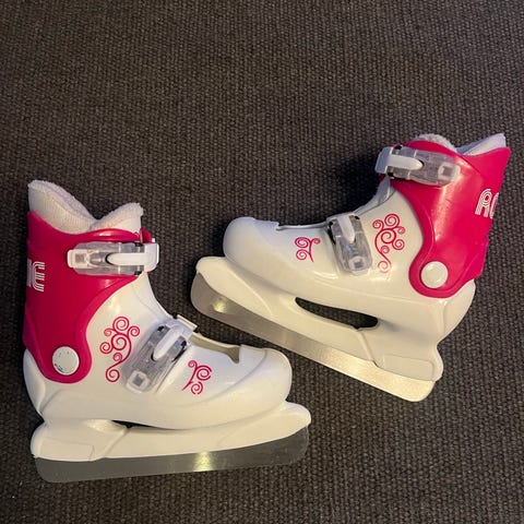 Rookie Övriga skridskor för barn i storlek 26. Skridskorna är svart och vita och har ett justerbart spänne för bättre passform. Designade för barn och anpassade för olika skridskoaktiviteter.