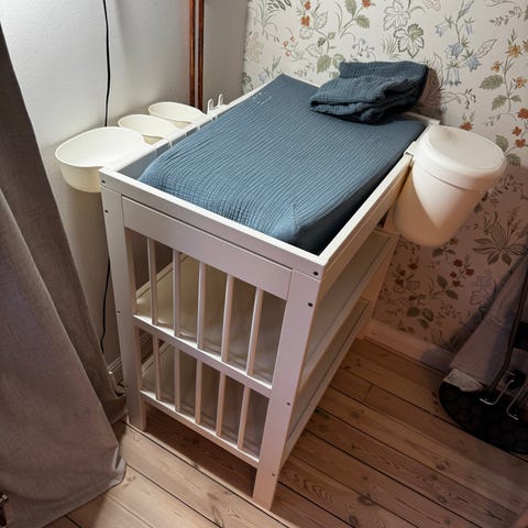 Vitt skötbord "gulliver" från IKEA. Skötbädd och annat två överdrag ingår, ett vitt och ett ljusgrönt med två hundar. Det gröna har en liten fläck som inte går bort, se bild.