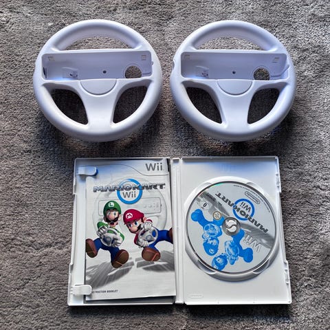 Nintendo Wii Mario Kart spel svensk manual inklusive två vita rattar orginal