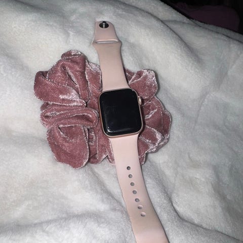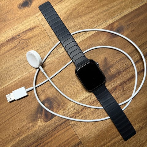 Apple Watch 6 (GPS + Cellular) begagnad med tre armband ett gult, ett vitt och ett mörkblått.