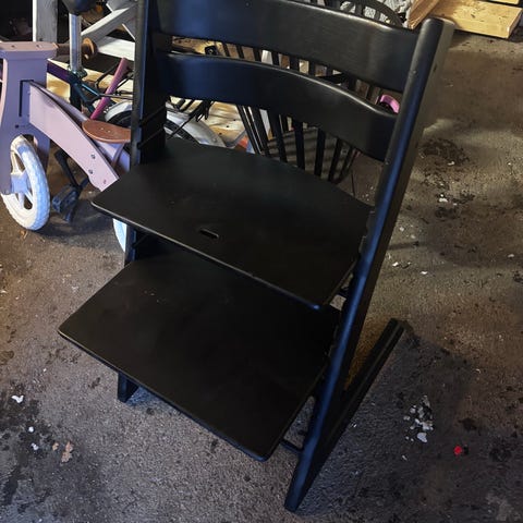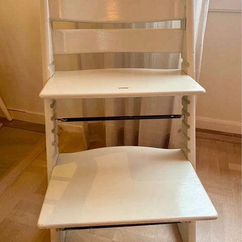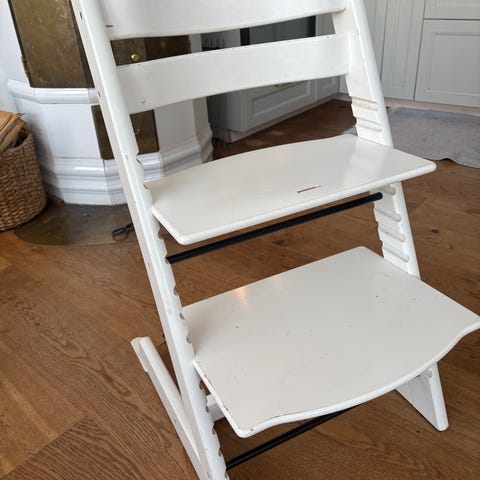 Stokke barnstol i trä. Justerbar sitt- och fotplatta för anpassning efter barnets storlek. Designad för att användas från småbarnsålder och uppåt. Färg: grå och vit.