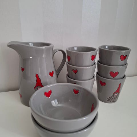 Glöggkanna och koppar & två skålar med rött hjärtmotiv