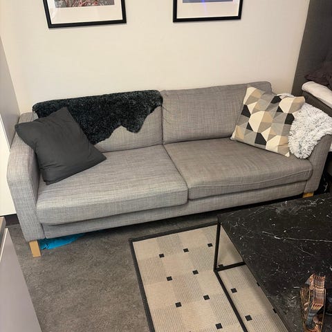 IKEA soffa med förvaring i grått tyg. Soffan har en integrerad förvaringsdel under sitsen och kan fällas ut till en bädd. Passar för vardagsrum eller gästrum där extra sovplats och förvaringsutrymme behövs.
