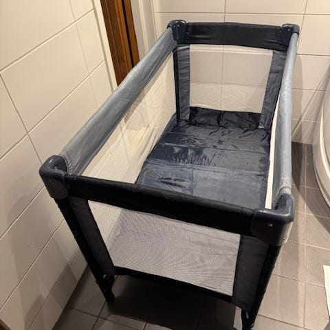 2 me resesäng i mörk blå färg. Sängen är lätt att fälla ihop för transport och förvaring. Materialet är slitstarkt och sidorna har nät för ventilation och insyn. Ekstra madrass och dyna medföljer.