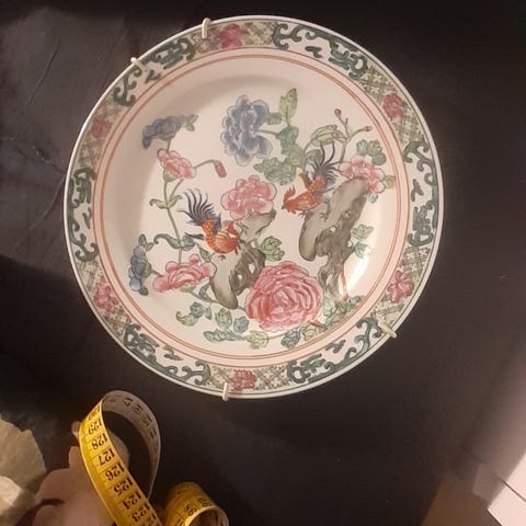 En keramiktallrik med blommönster. Signaturen "XVII M" finns på undersidan. Mått 13 x 5 cm, vikt 0,2 kg.