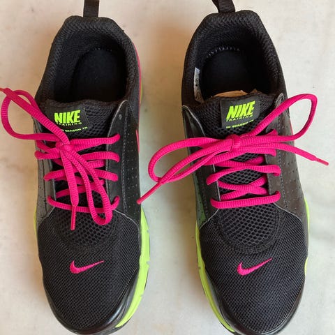 Nike löparskor i storlek 39 med lila och gröna färger. Skorna är anpassade för löpning och har en mesh-överdel för ventilation. Sulan är designad för att ge stöd och komfort under löpning. Har en liten skada men inget som syns.