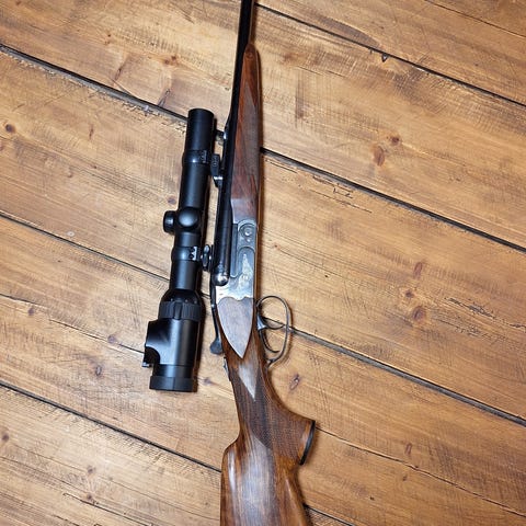 Merkel helix I den åtråvärda kaliber 6,5x55. Kite 2,5-15x56 belyst med snabbfäste, ljuddämpare a-tech, Merkel koffert för två pipor, en del olika ammunition skickas också med. Licens krävs.