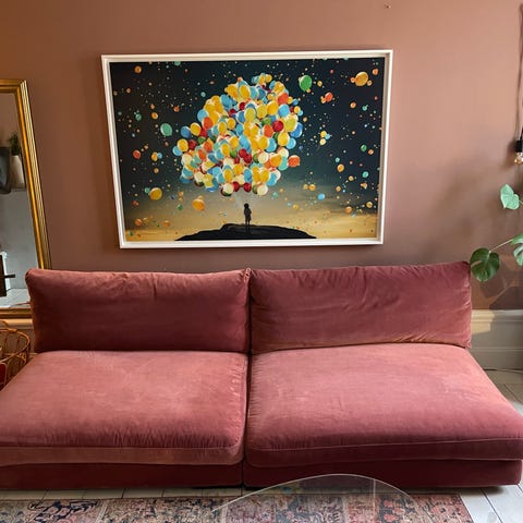 Jättenöjd med denna soffan! Håller komforten, skön att kura upp i pga den djupa sitsen. Lätt att torka av då det är sammet och drar inte åt sig fläckar som en vanlig tygsoffa gör.