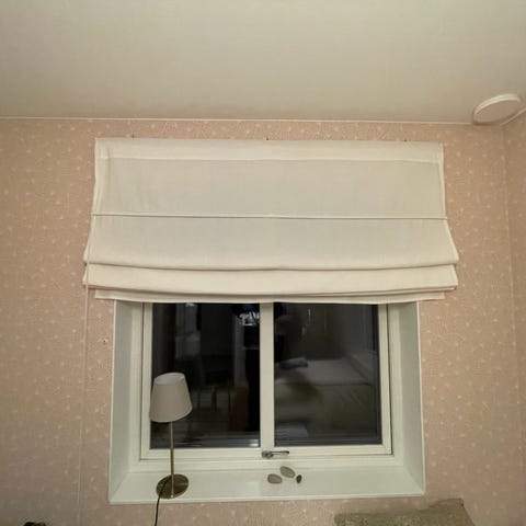 Beige hissgardin 170 cm bred. Osäker på material men ser ut som en linne/bomullsblandning.