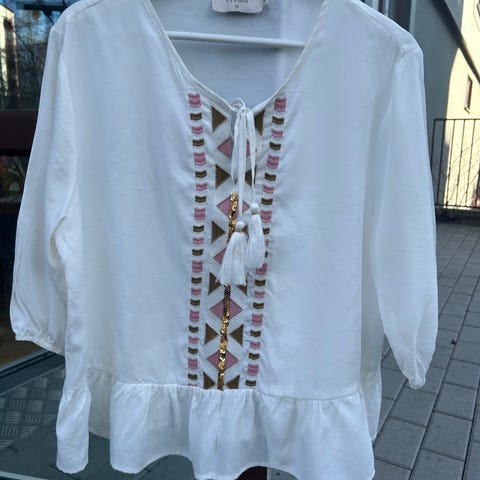 Cremefärgad blus med fint mönster framtill. Guldknappar i ärmslut. Ev saknas en knapp på ärmslut. Kan dubbelkollas om man önskar innan köp.