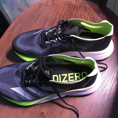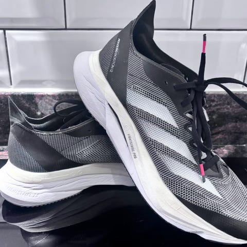 Adidas Adizero Finesse löparskor i storlek 44. Skorna är designade för löpning och har en färgkombination av blått, rött och vitt. Produkten inkluderar extra dubbar och verktyg för anpassning. Skorna är avsedda för sportbruk och är tillverkade med material som stödjer löpteknik och komfort.