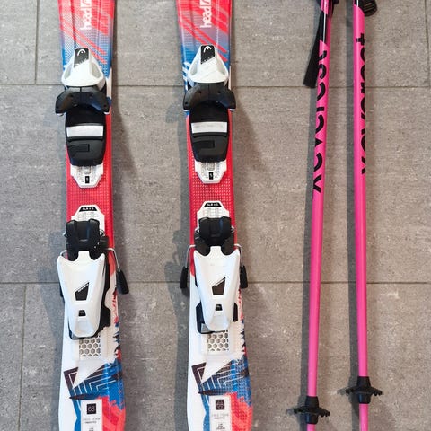 Pjäxorna är orange och vita med spännen för justering. Skidorna och pjäxorna är avsedda för barn och ungdomar.
