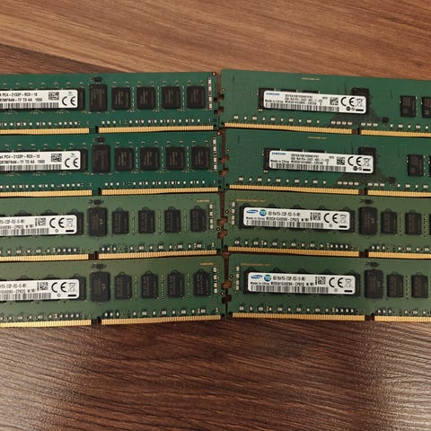 Totalt 64 GB DDR4 2133 MHz ECC registered minnen om 8 stycken 8 GB stickor enligt bilder.