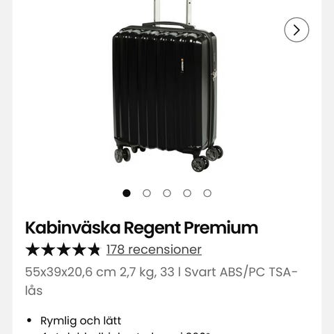 Rymlig och lätt kabinväska i tålig hårdplast (ABS/Polykarbonat) med 4 st dubbelhjul roterbara i 360°, TSA-lås, teleskophandtag i aluminium och dubbelsidig säkerhetsdragkedja. Insida med avskiljare, fack och remmar, samt foder av tålig polyester