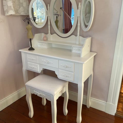 Fint nytt oanvänt sminkbord för barn. Är för litet för min dotter. Med led-belysning i spegeln och extra hyllor bakom spegeln. Pall medföljer.
