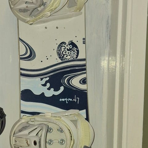 Cartel snowboard med tillhörande bindningar i svart. Snowboarden har en blå yta med röd grafik. Bindningarna är justerbara och designade för att fästa stadigt vid snowboarden. Produkten är avsedd för vintersport och användning på snö.