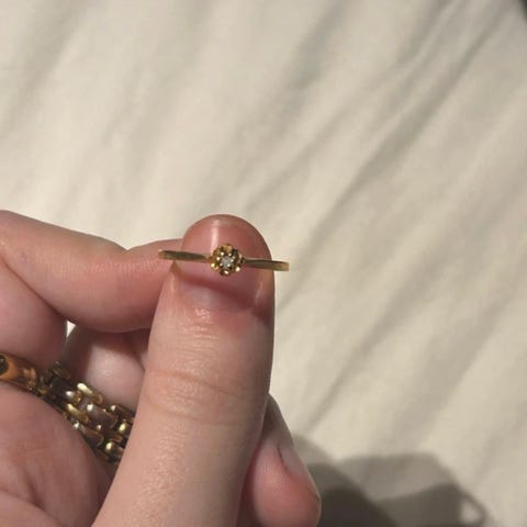 sparsamt använd, jag tror att den är köpt på Guldfynd för några år sedan men är inte helt säker. jag minns tyvärr inte vilken storlek det är på ringen, det enda jag vet är att den passar någon med smalare fingrar.