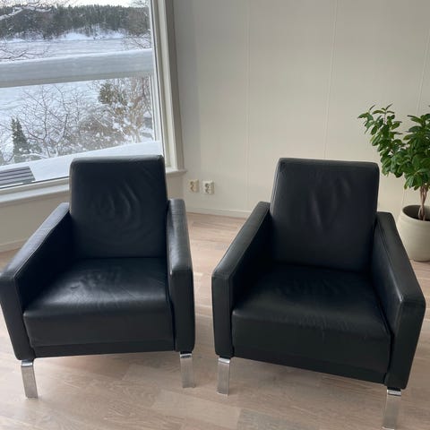 Här erbjuds ett matchande set om två kompakta soffor/fåtöljer med metallunderrede och läderdynor, formgivna av Ulf Scherlin. Kombinationen av det strama, grafiska stativet och lädrets mjuka patina skapar en tidlös kontrast: industriell precision möter varm, naturlig elegans. Resultatet är möbler som känns lika relevanta i en modern lägenhet som i en mer klassisk miljö.