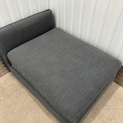 IKEA fåtölj i grått tyg. Fåtöljen har en klassisk design med armstöd och knappdetaljer på ryggstödet. Passar för sittplatser i vardagsrum eller läshörnor.