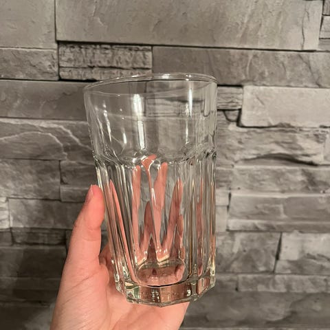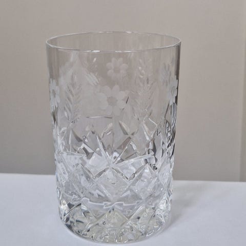 Sökes: Dricksglas/Highballglas, glas med mönster i klart glas. Glaset har en dekorativ slipning som ger ett mönster runt om.