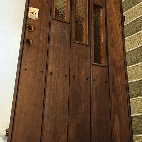 Tidstypisk teakdörr med karm samt sidofönster från 80-talet av hög kvalitet!