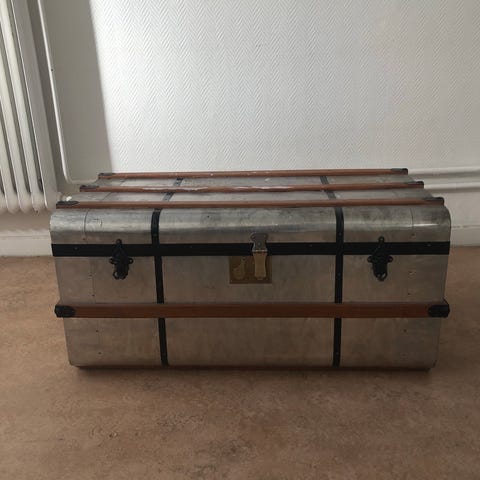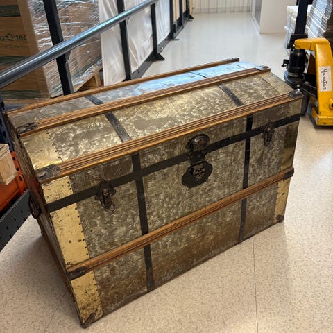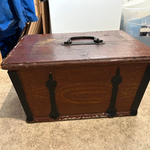 En antik kista som vi använt som skattkista 🏴 ☠️ och förvaring till leksaker/utklädningskläder i barnens lekrum.