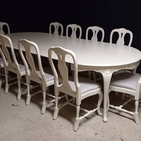 Bild 6 och 7. Matgrupp med 10 rokokostolar och ett stort bord med 3 iläggsskivor, längd 270 cm, bredd 120 cm. Nylackerad i antikvit färg och stolarna omklädda med nytt tyg. Pris 24900 kr.