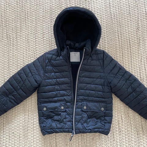 Svart/grå barnjacka med detaljer över hela jackan. Den är i polyester, storlek 110/116, unisex. Jackan har en huva och är försedd med reflexdetaljer runt ärmar och bröst för ökad synlighet. Liknade fleece innanför jackan. Passar för barn och kan användas som ytterplagg vid kallare väder.