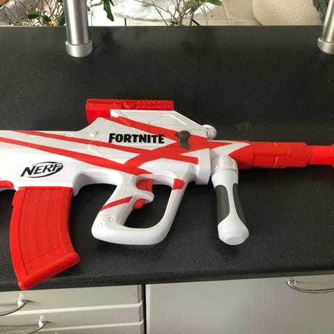 Få spelens spänning till livet med NERF Fortnite Compact SMG! Inspirerad av den populära utrustningen i Fortnite-spelet, har denna blaster den distinkta Ultra Red Wrap-designen och erbjuder kraftfullt, motoriserat dartskjutande nöje. Perfekt för snabba strider, denna blaster avfyrar 8 darts i följd genom att enkelt hålla ner accelerationsknappen för att aktivera motorn och sedan dra avtryckaren. Inkluderar 8 officiella NERF Elite-skumpilar som laddas i blasterens interna 8-darts magasin.